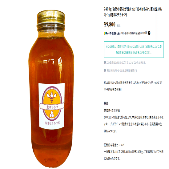 300g/自然の恵みが詰まった「松本はちみつ家の生はちみつ」初めての方や贈り物にぴったりなサイズ。手軽に始めたい方におすすめです